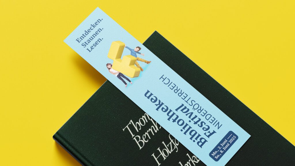 Die Bewerbung des Festivals war gleichzeitig die erste große Kampagne der neuen Marke Bibliotheken Niederösterreich. Das markentgetreue Kampagnendesign by message fand Anklang bei Groß und Klein.