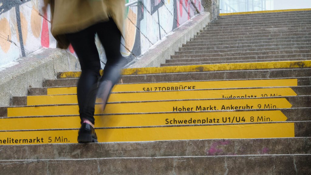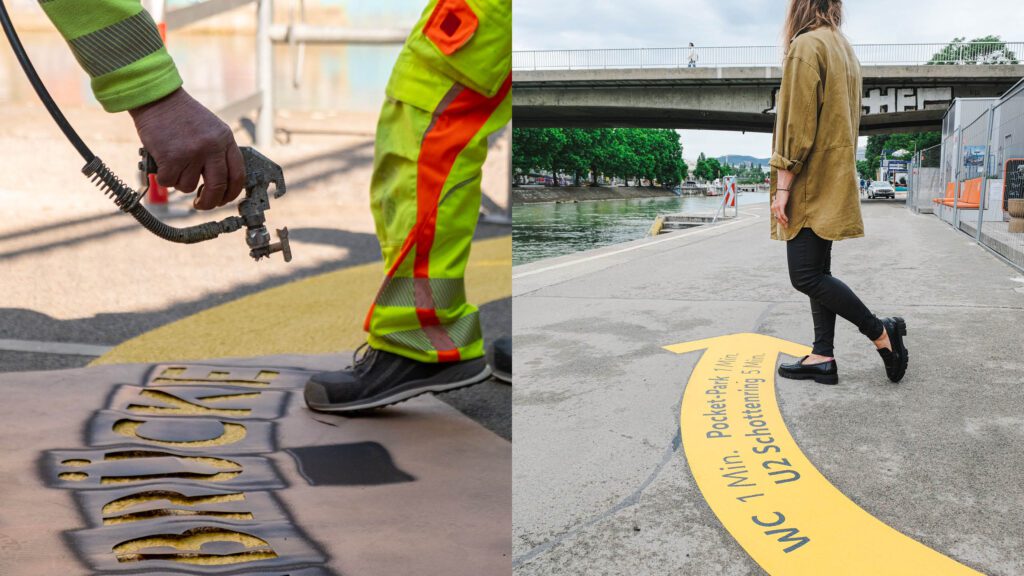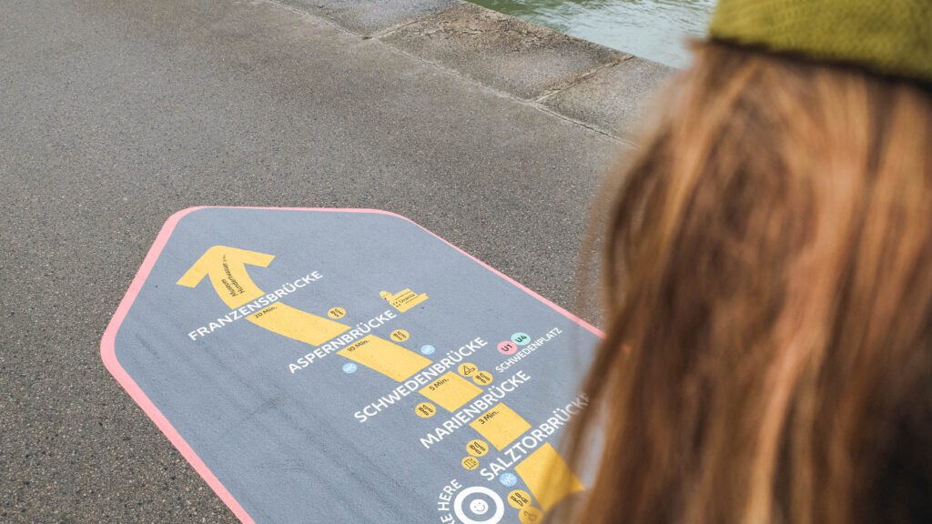 Das war natürlich noch nicht alles: Neben dem neuen visuellen Auftritt wird zukünftig die Orientierung entlang der Uferpromenade um einiges leichter. Wir gestalteten ein Bodenleitsystem – außerhalb der Graffiti-Zone, – das auf lauschige Platzerl und Sehenswertes verweist. Neben Übersichtsplänen bei Eingangspunkten machen quietschgelbe Wegweiser auf wichtige Landmarks und Highlights aufmerksam. Das neue Leitsystem wird nach und nach über das gesamte Freizeitareal ausgeweitet und beinhaltet auch Orientierungshilfen bei Treppen und Brücken.