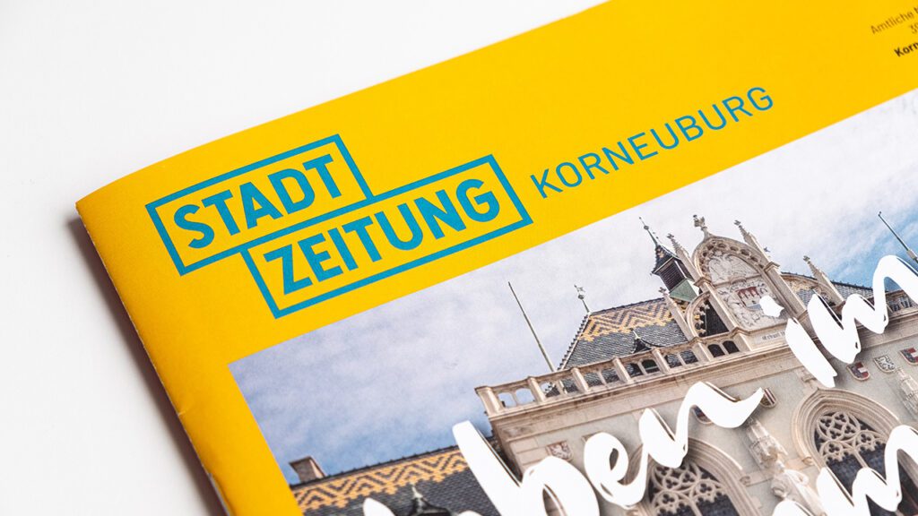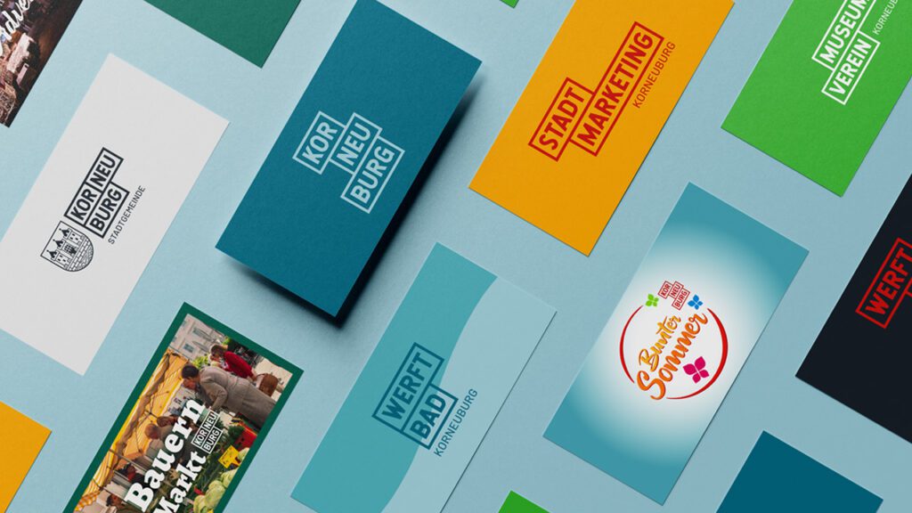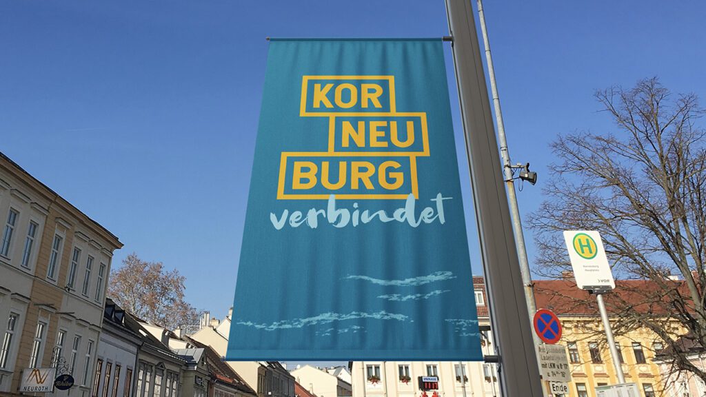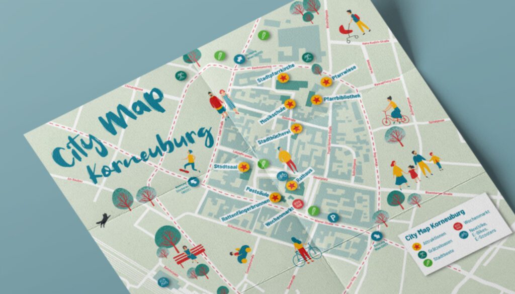 Unser Design ist seither auf Plakaten, Fahnen, in der Stadtzeitung, auf Visitenkarten, Briefpapieren und vielem mehr sichtbar. Für die Innenstadt haben wir auch eigens eine City-Map gestaltet, die auf Geschäfte, Lokale, Dienstleister und Attraktionen in der Stadt aufmerksam machen soll – selbstverständlich im Korneuburg-Design.